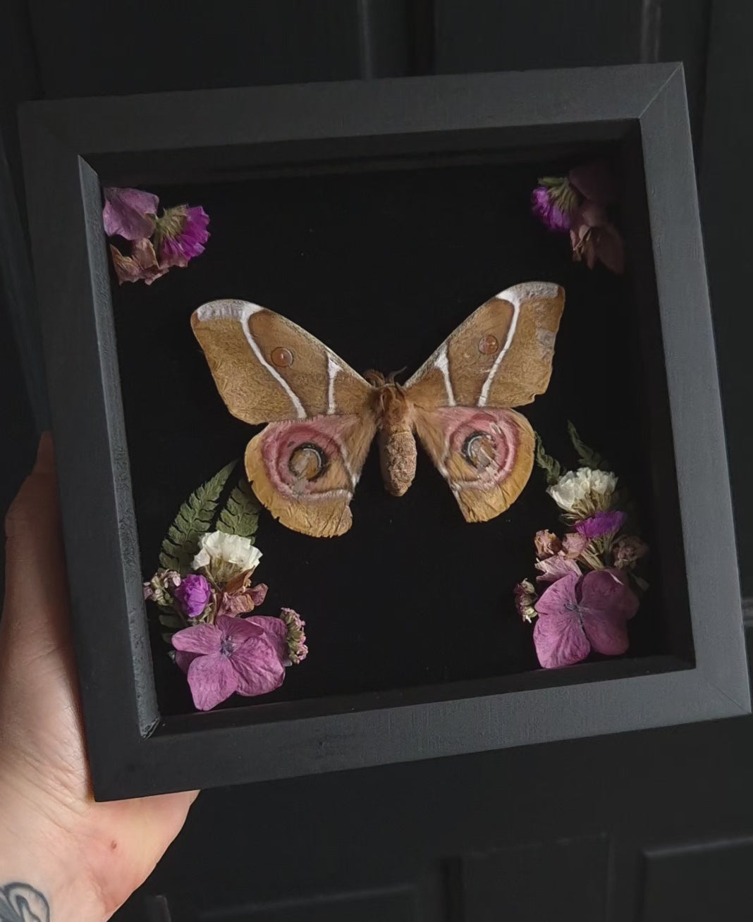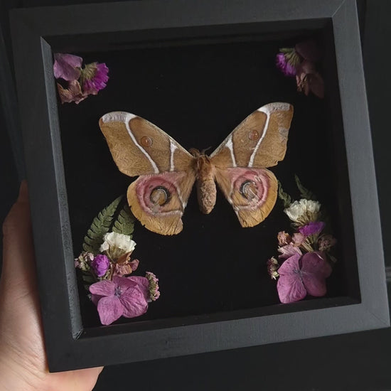 Bullseye Moth (Antherina Suraka) 19cm x 19cm entomology frame with black velour background and dried ferns, sea lavender, yarrow and hydrangea.