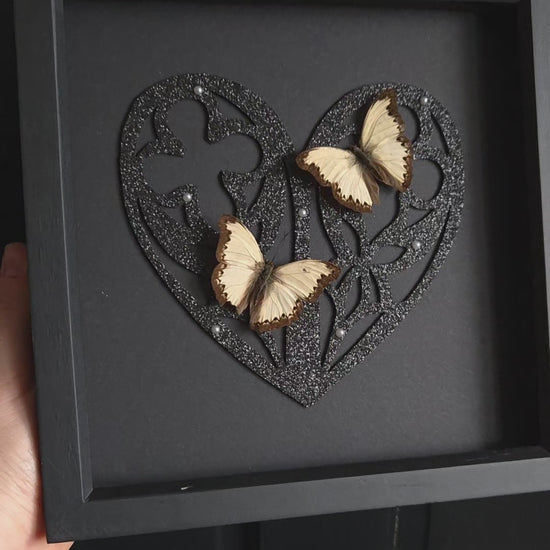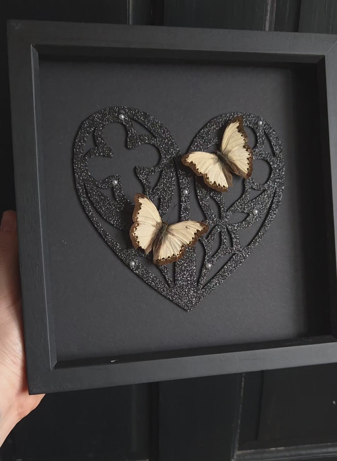 Common Glider butterflies (Cymothoe Caenis) 24cm x 24cm entomology frame with matte black background and hand-carved black gothic heart detail with pearls.